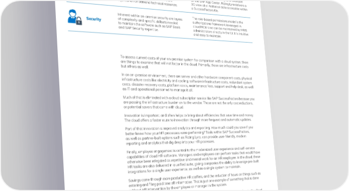 < Continued from previous page How cloud ON-PREMISE CLOUD increases ROI Years of historical data resides within the There’s no loss of on-premise data when Historical on-premise environment and life-cycle moving to cloud with Rizing Lyra, available Data management processes and servers are on the SAP App Center. Rizing Lyra delivers a 3D view of all historical data accessible within required which demand technical resources. a SuccessFactors tile. Inherent within on-premise security are layers The role-based permissions model is the authorizations framework leveraged in of complexity and speci昀椀c skillsets needed cloud HCM and can be maintained by HRIS Security to maintain the software such as SAP Basis administrators directly in the UI. It is intuitive and SAP Security expertise. and easy to maintain. To assess current costs of your on-premise system for comparison with a cloud system, there are things to examine that will not factor in the cloud. Primarily, those are infrastructure costs but others as well. In an on-premise environment, there are server and other hardware component costs, physical infrastructure costs like electricity and cooling, software infrastructure costs, redundant system costs, disaster recovery costs, platform costs, maintenance fees, support and help desk, as well as IT and operational personnel to manage it all. Much of that is eliminated with a cloud subscription service like SAP SuccessFactors because you are passing the infrastructure burden on to the vendor. Those are not the only cost reductions, or potential savers that come with cloud. Innovation is important, and often helps to bring about ef昀椀ciencies that save time and money. The cloud offers a faster route to innovation through more frequent and automatic updates. Part of that innovation is improved analytics and reporting. How much could you save if you better knew how your HR processes were performing? Tools within SAP SuccessFactors, as well as partner-built options such as Rizing Lyra, can provide user-friendly, modern reporting and analytics that dig deep into your HR processes. Finally, employee engagement is central to the modernized user experience and self-service capabilities of cloud HR software. Managers and employees can perform tasks that would have otherwise been relegated as repetitive and menial work for an HR employee. In the cloud, these HR tasks are also delivered in a uni昀椀ed suite, giving companies the ability to leverage pre-built integrations for a single user experience, as well as a single system to maintain. Savings come through more productive HR staffers, and the reduction of hours on things such as entering and 昀椀ling paid time off information. That is just one example of something that is done without HR intervention by the employee or manager in the system. There are many factors that can help you build a strong business case for upgrading to the cloud, the key is identifying which best 昀椀t your organization. There are real savings to be had in a cloud transformation. To achieve those savings, it is best to be prepared for the move. / 6 © 2020 Rizing LLC or a Rizing LLC af昀椀liate company. All rights reserved.