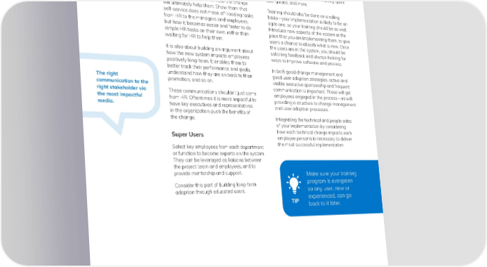 Communication Training Materials Good communication that drives A blended learning approach is user adoption begins before the recommended to ensure all employees feel SAP SuccessFactors subscription is comfortable. This can include in-tool videos, even purchased. presentation decks, in-person training, quick Employees want to know how the change user guides, and more. will ultimately help them. Show them that Training should also be done on a rolling self-service does not mean off-loading tasks basis—your implementation is likely to be an from HR to the managers and employees, agile one, so your training should be as well. but how it becomes easier and faster to do Introduce new aspects of the system at the simple HR tasks on their own, rather than pace that you are implementing them, to give waiting for HR to help them. users a chance to absorb what is new. Once It is also about building an argument about the users are in the system, you should be how the new system impacts employees soliciting feedback and always looking for positively long-term. It enables them to ways to improve software and process. better track their performance and goals, In both good change management and The right understand how they are on track to their good user adoption strategies, active and communication to the promotion, and so on. visible executive sponsorship and frequent right stakeholder via These communications shouldn’t just come communication is important. These will get the most impactful from HR. Oftentimes it is more impactful to employees engaged in the process—as will media. have key executives and representatives providing a structure to change management and user adoption processes. in the organization push the bene昀椀ts of the change. Integrating the technical and people sides of your implementation by considering Super Users how each technical change impacts each employee persona is necessary to deliver Select key employees from each department the most successful implementation. or function to become experts on the system. They can be leveraged as liaisons between the project team and employees, and to provide mentorship and support. Make sure your training Consider this part of building long-term program is evergreen adoption through educated users. so any user, new or TIP experienced, can go back to it later. / 21 © 2020 Rizing LLC or a Rizing LLC af昀椀liate company. All rights reserved.