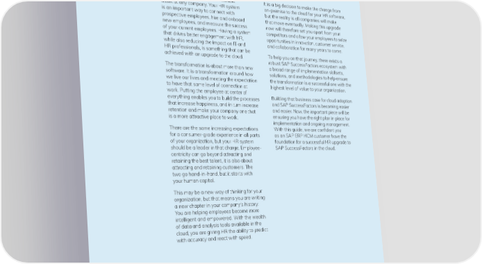 Conclusion 09 Employees remain the most valuable It is a big decision to make the change from asset at any company. Your HR system on-premise to the cloud for your HR software, is an important way to connect with but the reality is all companies will make prospective employees, hire and onboard that move eventually. Making this upgrade new employees, and measure the success now will therefore set you apart from your of your current employees. Having a system competitors and allow your employees to seize that drives better engagement with HR, opportunities in innovation, customer service, while also reducing the impact on IT and and collaboration for many years to come. HR professionals, is something that can be To help you on that journey, there exists a achieved with an upgrade to the cloud. robust SAP SuccessFactors ecosystem with The transformation is about more than new a broad range of implementation skillsets, software. It is a transformation around how solutions, and methodologies to help ensure we live our lives and meeting the expectation the transformation is a successful one with the to have that same level of connection at highest level of value to your organization. work. Putting the employee at center of Building that business case for cloud adoption everything enables you to build the processes and SAP SuccessFactors is becoming easier that increase happiness, and in turn increase and easier. Now, the important piece will be retention and make your company one that ensuring you have the right plan in place for is a more attractive place to work. implementation and ongoing management. There are the same increasing expectations With this guide, we are con昀椀dent you for a consumer-grade experience in all parts as an SAP ERP HCM customer have the of your organization, but your HR system foundation for a successful HR upgrade to should be a leader in that charge. Employee- SAP SuccessFactors in the cloud. centricity can go beyond attracting and retaining the best talent, it is also about attracting and retaining customers. The two go hand-in-hand, but it starts with your human capital. This may be a new way of thinking for your organization, but that means you are writing a new chapter in your company’s history. You are helping employees become more intelligent and empowered. With the wealth of data and analysis tools available in the cloud, you are giving HR the ability to predict with accuracy and react with speed. / 23 © 2020 Rizing LLC or a Rizing LLC af昀椀liate company. All rights reserved.