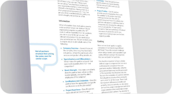goes elsewhere, did not like the responses, • Solution Information – Can the partner underestimated the required budget demonstrate a clear understanding of and could not get appropriate 昀椀nancing, what your organizational needs and procurement invalidated chosen partner). objectives are, and clearly describe a In many instances where it is not a pro- solution and path towards attaining them? curement requirement to do an RFP, it may • References – Does the partner have make more sense to just begin with a short speci昀椀c references in good standing list of three to four partners. These could that are relevant to the work you are be consulting 昀椀rms that have worked with attempting to do? your organization before or who have been referred to the business. Having them do a • Project Pro昀椀les – Can the partner short proposal and presentation may often provide resource biographies that could get you what is needed relatively quickly and be available for the project start date avoid a lengthy bid and tender affair. and a guarantee that they will not switch resources? Note: It is unlikely that Information partners will agree to a de昀椀nitive team in a response, but showing the willingness What information does the business need to to try to provide the “A” team and to make an informed partner decision? If your ensure no “bait and switching” of 昀椀nalized organization requires or prefers the RFP resources should be the ask for any route, it will be imperative that the questions organization looking to procure the best you ask in your tender get you as much support possible. relevant information that you need about your potential partner. Recommended areas Costing to inquire about would include some of the following: How can we do an apples-to-apples • Company Overview – General history of comparison of pricing amongst different Not all partners the company, how long they have been RFP bids? This is the constant challenge structure their pricing in business, where they are based, what when doing a tender, as it is possible to get the same, even for services and products they provide, etc. widely different costing in the responses similar scope. • Specializations and Differentiators – that are sent back from partners. What makes this partner unique in their It is therefore important to have a clearly space and separates them from their de昀椀ned scope in a response that can serve competition? as the basis for comparison from one • Bench Strength – How many consultants partner to another. Additionally, while the does the partner have, where are they procurement team may love the price point located globally, and are they direct of the lowest bid, this should be only one employees of the company? factor in the evaluation of a partner selection. Not all partners structure their pricing the • Certi昀椀cations and Credentials – Does the same, even for similar scope. There could partner have the appropriate and speci昀椀c be important differences in intellectual certi昀椀cations to do the job needed? property, resource seniority, on-site versus • Project Experience – Does the partner remote time, project management and minor have relevant and recent project scope variations that could make a large experience that demonstrate a track- difference in bid numbers. Pay attention to record of success? Is this experience the details and be sure to get as transparent analogous to what your company will a breakdown as possible on the partner’s be attempting with your project? pricing model. / 10 © 2020 Rizing LLC or a Rizing LLC af昀椀liate company. All rights reserved.