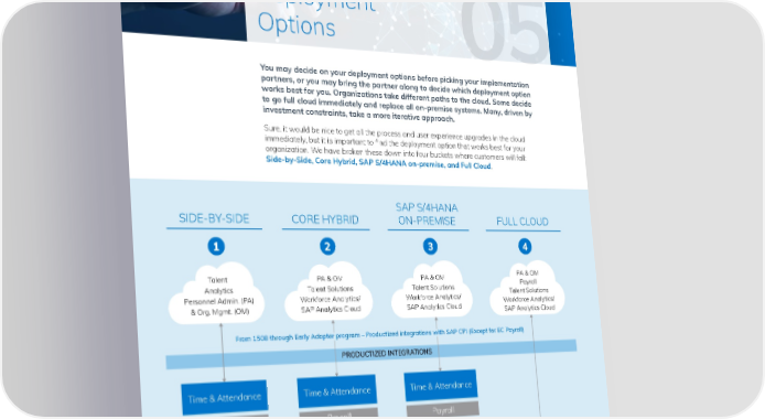 Deployment Options 05 You may decide on your deployment options before picking your implementation partners, or you may bring the partner along to decide which deployment option works best for you. Organizations take different paths to the cloud. Some decide to go full cloud immediately and replace all on-premise systems. Many, driven by investment constraints, take a more iterative approach. Sure, it would be nice to get all the process and user experience upgrades in the cloud immediately, but it is important to 昀椀nd the deployment option that works best for your organization. We have broken these down into four buckets where customers will fall: Side-by-Side, Core Hybrid, SAP S/4HANA on-premise, and Full Cloud. SAP S/4HANA SIDE-BY-SIDE CORE HYBRID FULL CLOUD ON-PREMISE 1 2 3 4 Talent PA & OM PA & OM PA & OM Analytics Talent Solutions Talent Solutions Payroll Personnel Admin. (PA) Workforce Analytics/ Workforce Analytics/ Talent Solutions & Org. Mgmt. (OM) SAP Analytics Cloud SAP Analytics Cloud Workforce Analytics/ SAP Analytics Cloud From 1508 through Early Adopter program – Productized integrations with SAP CPI (Except for EC Payroll) PRODUCTIZED INTEGRATIONS Time & Attendance Time & Attendance Time & Attendance Payroll Payroll Payroll PA ERP ERP S/4HANA ERP / 12 © 2020 Rizing LLC or a Rizing LLC af昀椀liate company. All rights reserved.