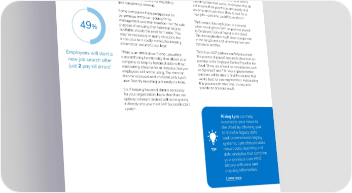 Archiving Historical HR Information Moving Payroll Data to the Cloud You may not need all the data in your Quickly and Accurately on-premise system to move to the cloud Perhaps the most important set of data system. However, there is the possibility when it comes to employee happiness is that you will need to have that information payroll data. Nobody wants to mess with a later. It may come in handy for analysis payroll system that works. Employees that do later, or you may need it for regulatory not receive their paychecks accurately and and compliance reasons. on-time are much more likely to look for a Some companies have propped up an new job—and who could blame them? on-premise instance—paying for its That means data replication is essential management and maintenance—for the sole when moving from SAP on-premise payroll purpose of ensuring that historical data is to Employee Central Payroll in the cloud. 49% available should the need for it arise. This The data replication itself plays a major role may be necessary in many situations, but in the length and cost of moving from one it can also be a costly method for keeping system to another. information around to use later. Tools from SAP partners can help automate Employees will start a There is an alternative. Rizing Lyra offers the process of payroll data replication from on- new job search after data archiving functionality that allows your premise to the Employee Central Payroll in the company to keep its historical data without cloud. These are offered by consultancies such * maintaining a license for an instance that your as SpinifexIT and TIK. Your implementation just 2 payroll errors employees will not be using. The data can partners will be able to 昀椀nd the solution that then be accessed and analyzed with Lyra’s works best for your organization. Automating user-friendly reporting and analytics tools. this process can save time, money, and So, if keeping historical data is necessary provide an accurate result. for your organization, know that there are options to keep it around without migrating it directly into your new SAP SuccessFactors system. Rizing Lyra can help accelerate your move to the cloud by allowing you to transfer legacy data and decommission legacy systems. Lyra also provides TIP robust data reporting and data analytics that combine your previous core HRIS history with new and ongoing information. Learn more * The Workforce Institute at Kronos Incorporated. / 19 © 2020 Rizing LLC or a Rizing LLC af昀椀liate company. All rights reserved.
