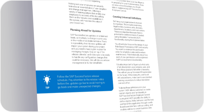 The More Training the Better Ongoing Strategies Training should build an understanding of Before and During all modules for your implementation team, Implementation so that they are put in the best position to succeed. That training should go beyond Now that you have done your due diligence PowerPoint and be hands-on. Again, cross- in preparing for your implementation, there module training should be happening. are also overarching steps you should Making sure your employees are properly take in implementing SAP SuccessFactors trained is an essential piece of user adoption Employee Central. and change management. Offering a variety of training options that enable your employees to succeed, while also selling Creating Universal De昀椀nitions them on the features and capabilities in the system, will maximize the value of De昀椀ning your organizational structure is important. This includes examining your investment. legal entities, business units, divisions, departments, locations, and cost centers. Planning Ahead for Updates These are important because there is potential for additional layers if needed SAP SuccessFactors updates on a biannual using Metadata Framework (MDF) basis, so it is likely to change in some way functionality during the implementation. in the middle of an implementation. There You should also focus on the design of your is a possibility that the new updates will Role Based Permissions (RBP) and security. impact your system during your project, You want to minimize the permission and you need to have a plan in place for roles for simplicity’s sake and to reduce managing changes. Stay on top of the maintenance. Think holistically about how release calendar, and make sure to be ready each of your permissions will complement to handle any con昀椀guration changes that could be necessary. We will discuss release SAP SuccessFactors functionality. management in further detail later. It is also important to 昀椀gure out what sorts of job descriptions your company uses, and how those positions fall within a hierarchy. This will set you up for easier HR automation in the future. When doing this, and for all Follow the SAP SuccessFactors release HR-related items, make sure to use standard schedule. Pay attention to the release notes naming conventions to reduce translation before the updates go live to avoid having to cost and effort. TIP go back and make unexpected changes. To bring these de昀椀nitions into your system, MDF allows customers to create custom objects and functionality in SAP SuccessFactors Employee Central as required. MDF provides the ability to de昀椀ne objects, 昀椀elds, behavior, and the look and feel of the application through a web- based user interface, without coding, and enables admins to create business rules to implement custom logic. / 16 © 2020 Rizing LLC or a Rizing LLC af昀椀liate company. All rights reserved.