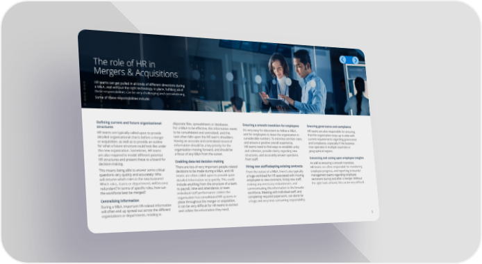 The role of HR in Mergers & Acquisitions HR teams can get pulled in all kinds of di昀昀erent directions during a M&A, and without the right technology in place, ful昀椀lling all of these responsibilities can be very challenging and overwhelming. Some of these responsibilities include: De昀椀ning current and future organizational disparate 昀椀les, spreadsheets or databases. Ensuring a smooth transition for employees Ensuring governance and compliance structures For a M&A to be e昀昀ective, this information needs It’s very easy for discontent to follow a M&A, HR teams are also responsible for ensuring HR teams are typically called upon to provide to be consolidated and centralized, and this and for employees to leave the organization in that the organization stays up to date with detailed organizational charts before a merger task often falls upon the HR team’s shoulders. considerable numbers. To minimise attrition rates, current requirements regarding governance or acquisition, as well as to provide an outline Having an accurate and centralized record of and ensure a positive overall experience, and compliance, especially if the business for what a future structure could look like under information should be a key priority for the HR teams need to 昀椀nd ways to establish unity now operates in multiple countries or the new organization. Sometimes, HR teams organization moving forward, and should be and cohesion, provide clarity regarding new geographical regions. are also required to model di昀昀erent potential a focus of any M&A from the outset. structures, and accurately answer questions HR structures and present these to a board for Enabling data-led decision making from sta昀昀. Extracting and acting upon employee insights decision-making. As well as ensuring a smooth transition, This means being able to answer some critical There are lots of very important people-related Hiring new sta昀昀/adapting existing contracts HR teams are often responsible for monitoring questions very quickly and accurately: Who decisions to be made during a M&A, and HR From the outset of a M&A, there’s also typically employee progress, and reporting to boards/ will assume which roles in the new business? teams are often called upon to provide quite a huge workload for HR associated with moving management teams regarding employee Which roles, teams or departments will become detailed information very quickly. This could employees to new contracts, hiring new sta昀昀, sentiment during and after a merger. Without include anything from the structure of a team, making any necessary redundancies, and the right tools at hand, this can be very di昀케cult. redundant? In terms of speci昀椀c roles, how can to payroll, time and attendance, or even communicating this information to the broader the workforce best be merged? individual sta昀昀 performance. Unless the organization has consolidated HR systems in workforce. Meeting with individual sta昀昀, and Centralizing information completing required paperwork, can alone be During a M&A, important HR-related information place throughout the merger or acquisition, a huge and very time-consuming responsibility. it can be very di昀케cult for HR teams to extract will often end up spread out across the di昀昀erent and collate the information they need. organizations or departments, residing in 5