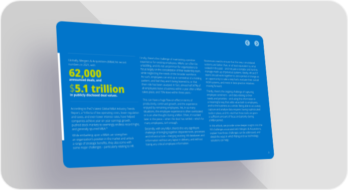 Firstly, there’s the challenge of maintaining a positive Businesses need to ensure that the new, consolidated Globally, Mergers & Acquisitions (M&A) hit record experience for existing employees. M&As can often be systems are better than, or at least equivalent to, what numbers in 2021, with unsettling, and it’s not uncommon for organizations to existed in the past – and not just a complex and hard-to- focus largely on the consolidation of their leadership team, manage mash-up of previous systems. Ideally, HR and IT while neglecting the needs of the broader workforce. teams should work together to use a period of change as 62,000 As such, employees can end up in somewhat of a holding an opportunity to take a step back, evaluate their overall announced deals, and pattern, and feel they aren’t being listened to, or that HCM systems, and invest in best-practice initiatives their role has been usurped. In fact, almost half (47%) of moving forward. all employees leave a business within a year after a M&A Thirdly, there’s the ongoing challenge of capturing 2 $5.1 trillion takes place, and 75% leave within three years. employee sentiment – and data relating to their in publicly disclosed deal values. needs and priorities – and using this information in This can have a huge 昀氀ow-on e昀昀ect in terms of a meaningful way that adds value both to employees, productivity, continued growth, and the experience and to the business as a whole. Being able to accurately According to PwC’s latest Global M&A Industry Trends enjoyed by remaining employees. Yet, in so many capture and analyse data requires having sophisticated Report, a “trifecta of low operating costs, lower regulation situations, the employee experience is often overlooked tools in place, and it’s vital that these tools are given and taxes, and even lower interest rates, have helped or is an afterthought during a M&A. Often, it’s tackled a su昀케cient amount of focus and priority during companies achieve year-on-year earnings growth, later in the piece – when the dust has settled – which for a M&A period. pushed stock markets to seemingly endless record highs, many employees, isn’t enough. 1 In this eBook, we provide some deeper insights into the and generally spurred M&A.” Secondly, with any M&A, there’s the very signi昀椀cant HR challenges associated with Mergers & Acquisitions, While embarking upon a M&A can strengthen challenge of bringing together disparate tools, processes explain how these challenges can be addressed, and an organization’s position in the market and unlock and infrastructure – merging existing HR databases and detail the ways in which Rizing and our technology a range of strategic bene昀椀ts, they also come with information without any lapse in delivery, and without solutions can help. some major challenges – particularly relating to HR. losing any critical employee information. 2