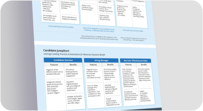 Rizing Packaged O昀昀erings with Qualtrics Lifecycle QuickStart Leverage Leading Practices & Automation for Maximum Business Bene昀椀t Onboarding Future Expansion Opportunities Exit Features Bene昀椀ts First Time Change in Performance Awards Features Bene昀椀ts Manager Manager Management NominationJenny Hall, director of project catalyst, carhartt Triggered by hiring XM Institute leading Trigged by XM Institute leading into SuccessFactors practices enable Features Bene昀椀ts o昀昀boarding process practices enable EC based on employee engagement. Triggered by an event. Set actions based and intelligent employee engagement. business rules on any trouble spots automation. in Qualtrics. with transition . Integrated solution Insights Integrated solution Automation reduces Unique to the Automation reduces governed by on employee governed by manual intervention business rules, experience and business rules, individual using a need for HR or and follow-up lifecycle project . manager intervention . distribution, expectations, distribution, activities. collection, belonging and collection, and analysis. rejoining possibility. and analysis. Maximize value from unlimited Set multiple touch Assess experience as lifecycle licenses. points (week one, employee acclimates . month one…etc). Action planning extension possible. Secure SFTP Integration to SuccessFactors record Action planning extension possible. is included, 22 standard 昀椀elds and two custom SSO authentication is available to link responses to the Must be using the required event reasons as individual without the use of a manual authentication step. indicated (e.g., “First time manager”). Candidate JumpStart Leverage Leading Practices & Automation for Maximum Business Bene昀椀t Candidate Solution Hiring Manager Recruiter E昀昀ectiveness Index Features Bene昀椀ts Features Bene昀椀ts Features Bene昀椀ts Gives recruiters, XM Institute leading Triggered at 昀椀ve XM Institute Triggered once a XM Institute leading di昀昀erent points across candidate enters practices enhance or recruitment practices enable leading practices candidate lifecycle. enable employee the interview hiring manager managers the ability direct feedback to engagement. stage of the experience and review their own individual recruiters recruitment process. improve process performance, and about the candidate’s understand where experience at each e昀케ciency. Integrated solution Expedited existing recruitment stage of the process. governed by process, implementation practices might be with JavaScript, with precon昀椀gured Focus on hiring Expedited failing across all parts pop-up and questions and manager KPIs: implementation of the business. SAP intelligent dashboards. Experience, with precon昀椀gured services triggers. Expectation, Trust, questions and No additional Insights Con昀椀dence in Hire, dashboards. Multiple touchpoints questions required, on candidate and Speed to Hire. data is drawn from the experience, at investigate, apply, screen, interview Prebuilt candidate cycle and expectations, communication 昀椀ltered by recruiter. belonging and and o昀昀er stages. joining possibility. guide to assist in deployment success. Get actionable insights to improve your employee experience at every touchpoint For more information or an overview of the Qualtrics, rizing.com info@rizing.com please visit rizing.com or send an email to hcm@rizing.com Copyright © 2023 Rizing LLC or a Rizing LLC a昀케liate company. All rights reserved. This document is provided for information purposes only, and the contents are subject to change without notice. This document is not warranted to be error-free, nor subject to any other warranties or conditions, whether expressed orally or implied in law, including implied warranties and conditions of merchantability or 昀椀tness for a particular purpose. We speci昀椀cally disclaim any liability with respect to this document, and no contractual obligations are formed either directly or indirectly by this document. This document may not be reproduced or transmitted in any form or by any means, electronic or mechanical, for any purpose, without our prior written permission. All other trademarks referenced herein are the property of their respective owners.
